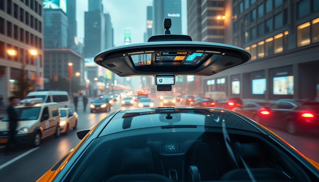 Fahrzeug im urbanen Umfeld mit autonomer Technologie, futuristische Fahrzeugtechnik, Smart City Mobilität.