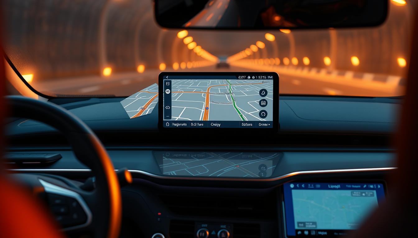 Fahrzeug mit digitaler Navigation unterwegs im Tunnel, innovative Tech-Gadgets im Auto, moderne Fahrzeugtechnik, digitaler Kartenmonitor.