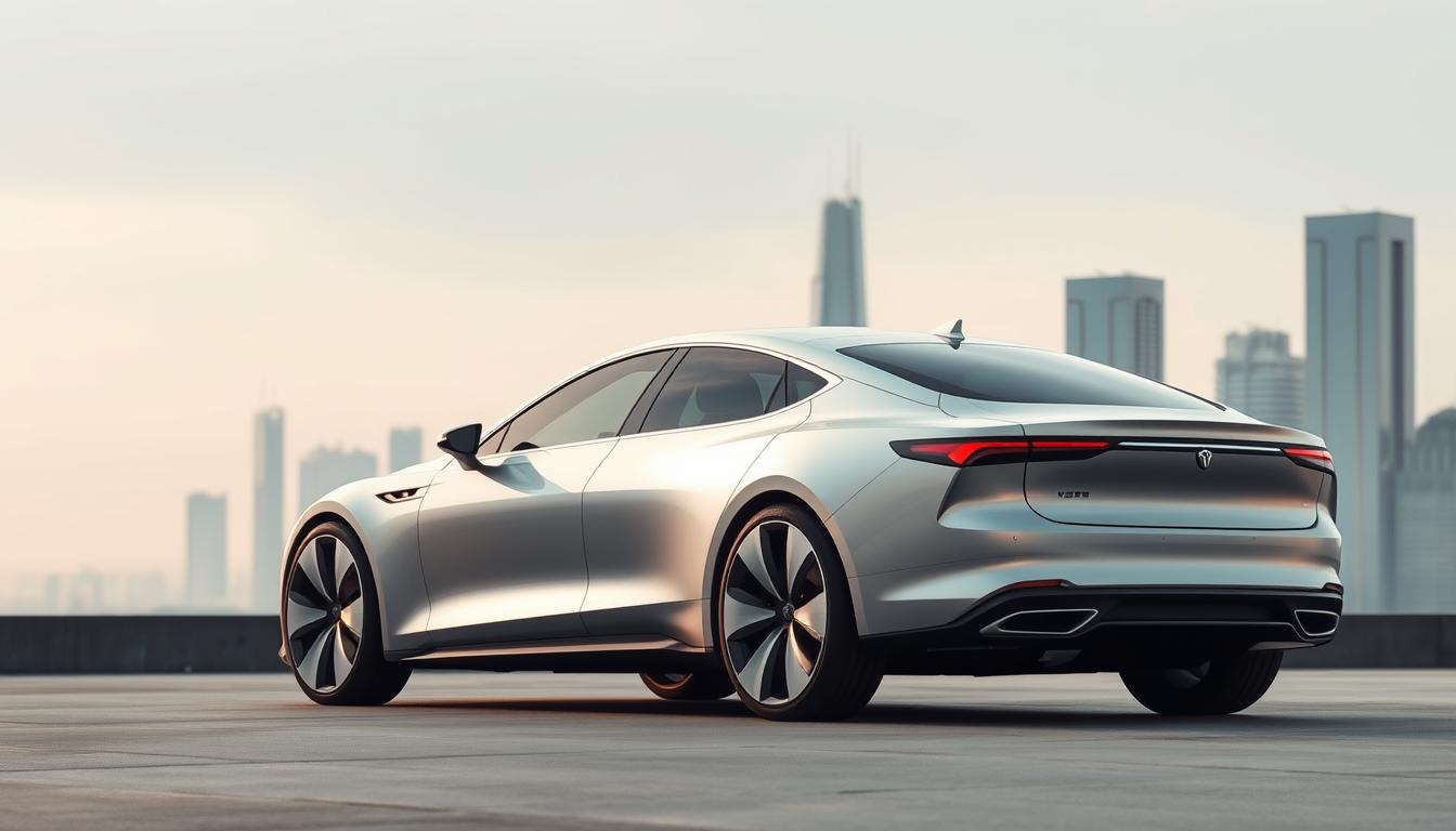Stylischer Tesla Model S in Mamorfrost-Silber auf einer urbanen Parkgarage.